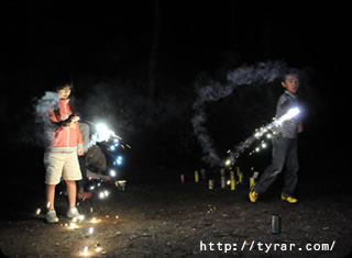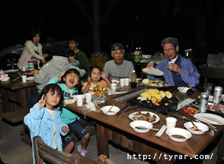 | 夜はバーベキュー&花火です! バーベキューは専用スペースをお借りしているので、広くて 快適♪ (ただちょっと虫が怖いけど・・・・) 美味しいお肉、野菜・・・鉄板で大盛りの焼きそばも作って、 皆さんと大いに盛り上がりました^^ 食後はバーベキュー広場の横で小さな花火大会。 子供たちは各々、おっかなビックリで手持ち花火に火をつけて、 楽しんでいました。 火祭りの花火も良かったけど、小さな子は怖がって泣いてしまっ ていたから・・・これくらいがちょうどいいのかもしれません(笑) |
