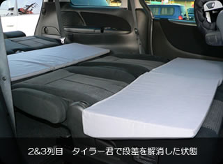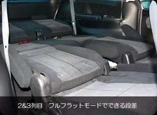| H18のフルモデルチェンジ前のMPVです。 2&3列目をフルフラットモードにします。 ヴォクシーやノア同様の階段状の段差ができます。 |