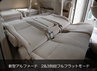 | 2008年5月発売の新型アルファードです。 2&3列目をフルフラットモードにします。 ハイスペック車ならではのかなりの段差があります! (ヴェルファイアもシート形状は同様) 3列目はシート構造が大幅に変わり、背もたれをたた んで跳ね上げる仕様になっています。 その為旧アルファードよりも大きな段差が・・・・。 |
